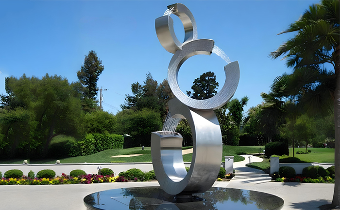 不銹鋼材質(zhì)賦予了雕塑現(xiàn)代感與時(shí)尚氣息,其光滑的表面能完美地反射周圍的環(huán)境與光影,當(dāng)噴泉開啟,水流與光影相互交織,在不同的時(shí)段、不同的天氣條件下,呈現(xiàn)出千變?nèi)f化的視覺效果。白天,陽光灑在水面與雕塑上,閃耀著金色的光芒;夜晚,配合精心設(shè)計(jì)的燈光,噴泉雕塑又成為夜空中最璀璨的存在,為城市的夜景增添了一份浪漫與神秘。